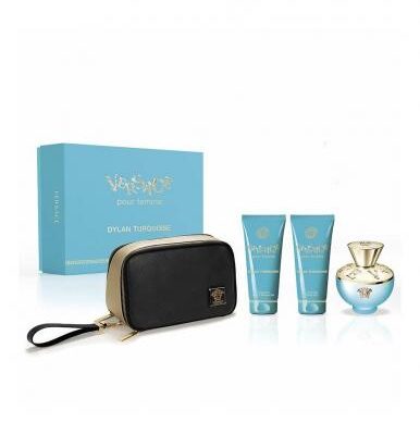Versace Dylan Turquoise 4 Pcs Set For Women: 3.4 Eau De Toilette Spray + 0.16 Eau De Toilette + 3.4 Body Lotion + 3.4 Shower Gel (Hard Box)
